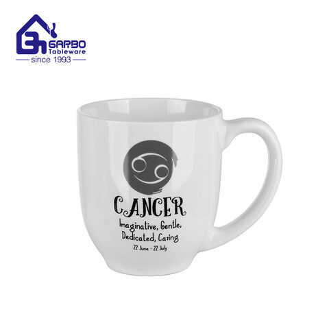 Factory wholesale handgrip ceramic coffee mugs offer a simple but fashionable look with a black printing decal on the outwall of the ceramic cups.