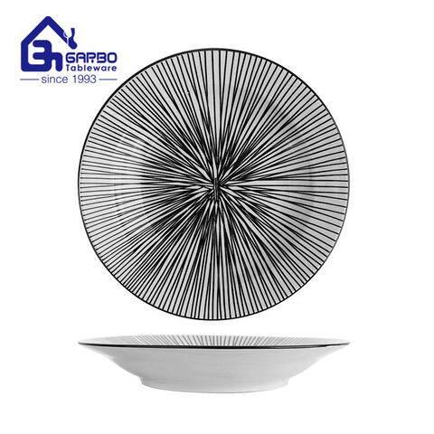 The round-shaped ceramic deep plate is simple but fashionable with the black line design under the glazed craft.