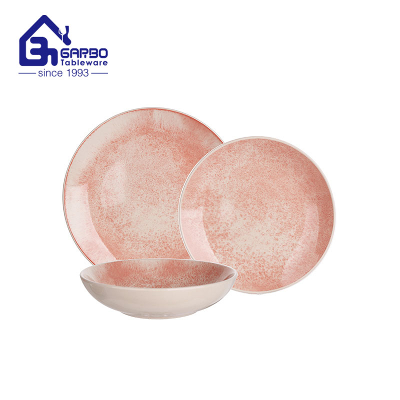 A perfect blend of style and sophistication with pink-orange color glazed design dinnerware set in wedding party.