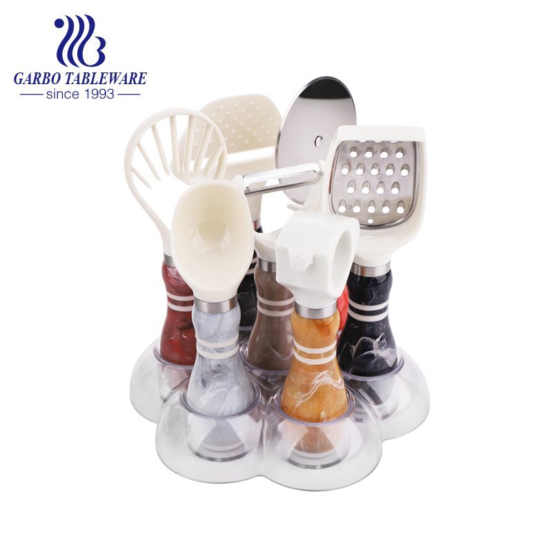 ●The utensil set includes: Soup Ladle, Solid Spoon, Slotted Spoon, Solid Turner, Slotted Turner, Potato Pusher, Can Opener, Whisk, Grater, Spatula, Tongs, Ice Scream Scooper, Beer Opener Peeler,Measuring Cups, Measuring Spoons. e provide a kitchen spatula tools kit of 12 accessories that will help you enjoy a nice life. Pls send us any inquiry of that.